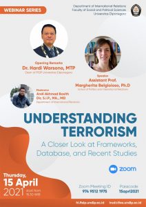 Departemen Hubungan Internasional Fakultas Ilmu Sosial dan Ilmu Politik Universitas Diponegoro menyelenggarakan webinar bertajuk Understanding Terrorism: A Closer Look at Frameworks, Database, and Recent Studies