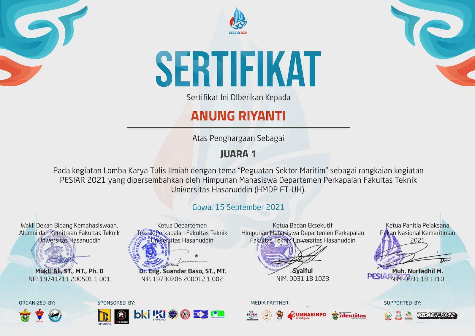 Kompetisi yang dilaksanakan di Gowa pada 15 September 2021 ini mengusung tema “Penguatan Sektor Maritim”, dan menjadi wadah bagi mahasiswa dari berbagai universitas di Indonesia untuk mengembangkan gagasan strategis mengenai sektor maritim nasional.