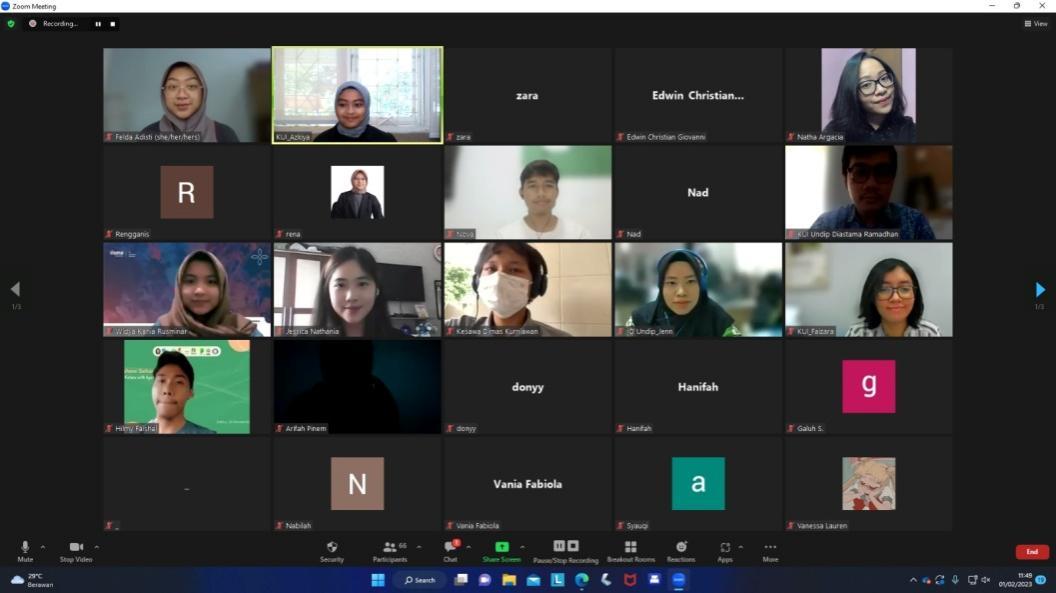 Semarang – Jawa Tengah. Kantor Urusan Internasional Universitas Diponegoro (KUI Undip) kembali mengadakan sosialisasi IISMA 2023. Acara tersebut mengangkat topik 2nd Round IISMA 2023 Preparation (Tips and Tricks for Langauge Proficiency Test) pada Rabu (01/02). Acara ini merupakan kegiatan lanjutan dari Sosialisasi IISMA 2023 yang telah terlaksana pada Selasa (24/01). Pada kesempatan tersebut, KUI Undip mengundang tiga pembicara yang merupakan awardee dari IISMA dan IISMAeVo 2022, yaitu Felda Adisti (Program Studi Arsitektur, Fakultas Teknik), Widya Kania Rusminar (Program Studi Informasi dan Humas, Sekolah Vokasi), dan Jessica Nathania (Program Studi Hubungan Internasional, Fakultas Ilmu Sosial dan Ilmu Politik).