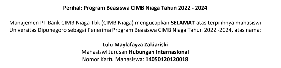 Lulu Maylafayza Zakiariski, mahasiswa Program Studi Hubungan Internasional (HI) FISIP Undip, terpilih sebagai penerima Program Beasiswa CIMB Niaga Tahun 2022–2024. Beasiswa ini diberikan oleh PT Bank CIMB Niaga Tbk sebagai bentuk dukungan kepada mahasiswa berprestasi di berbagai perguruan tinggi di Indonesia.