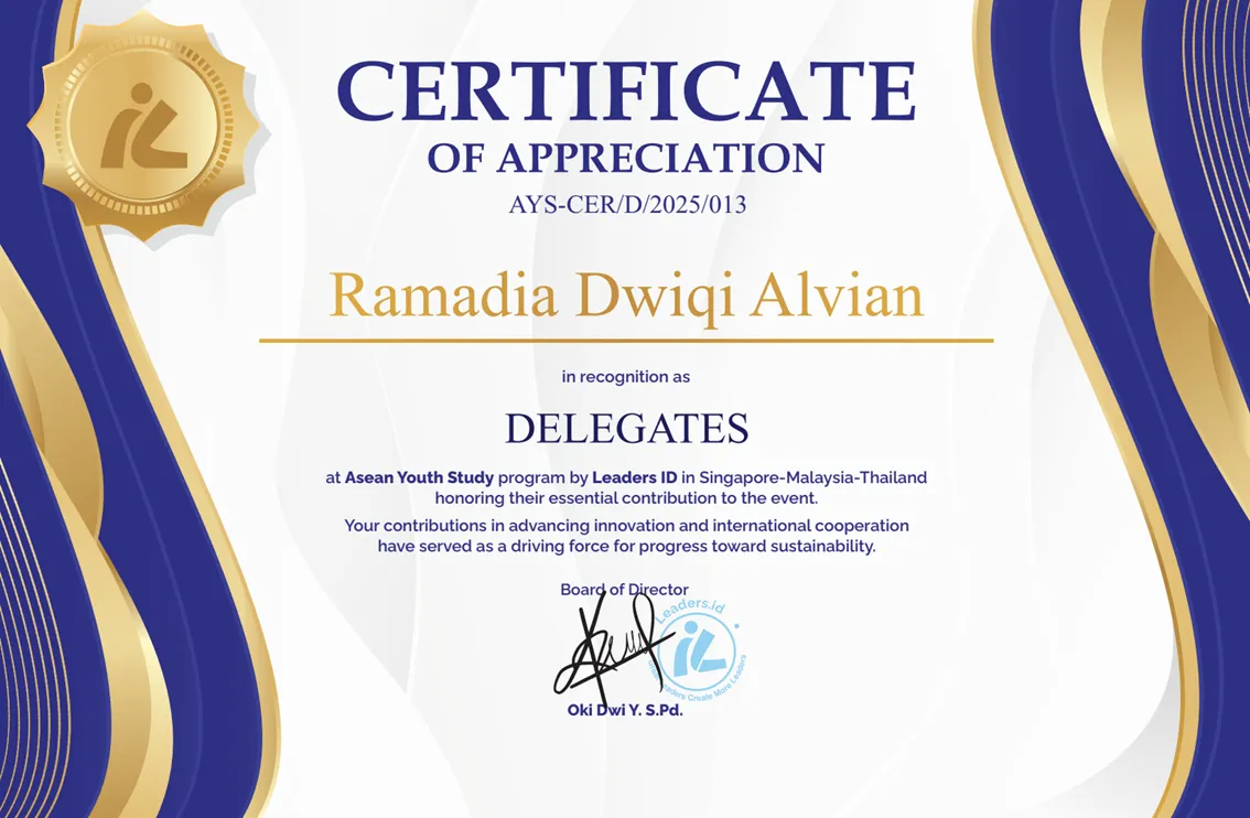 Fakultas Ilmu Sosial dan Ilmu Politik Universitas Diponegoro kembali menunjukkan kiprah mahasiswa di kancah internasional.Ramadia Dwiqi Alvian, mahasiswa S1 Hubungan Internasional, terpilih sebagai Delegates dalam program ASEAN Youth Study 2025 yang diselenggarakan oleh Leaders ID. Kegiatan ini berlangsung lintas negara, mencakup Singapura, Malaysia, dan Thailand.