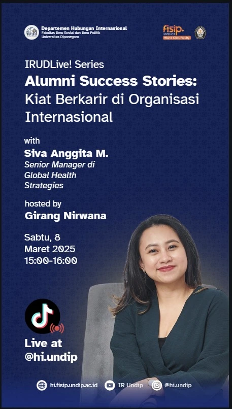 Pada Sabtu, 8 Maret 2025, acara IRUDLIve untuk pertama kalinya dilakukan bersama Siva Anggita Maharani yang saat ini menjadi Senior Manajer di Global Health Strategies. Judul utama dari kegiatan kali ini adalah “Kiat Berkarier di Organisasi Internasional” dengan tujuan untuk membagikan pengalaman alumni mengenai prospek karier bagi alumni HI dalam bekerja di organisasi internasional.
